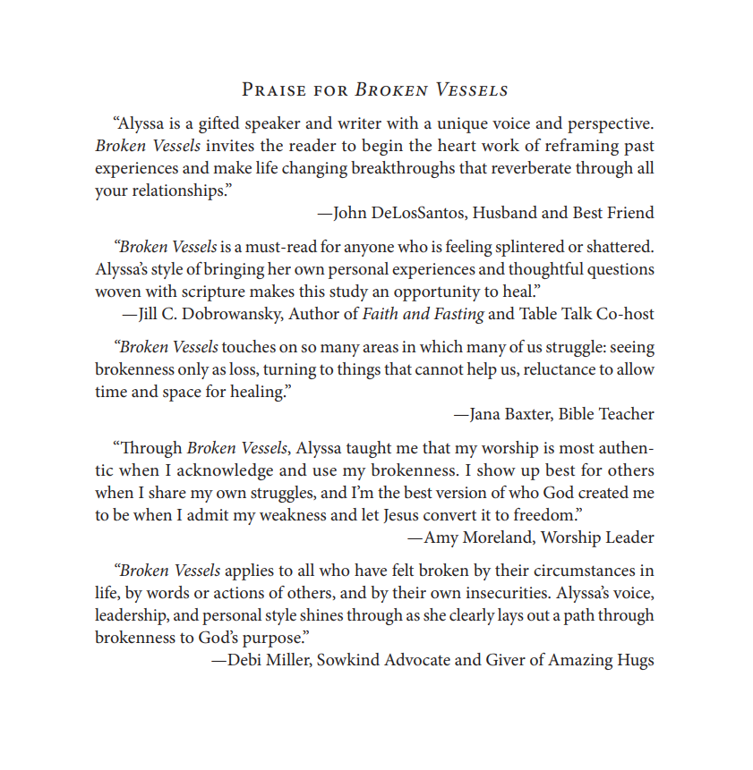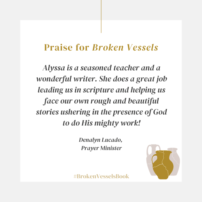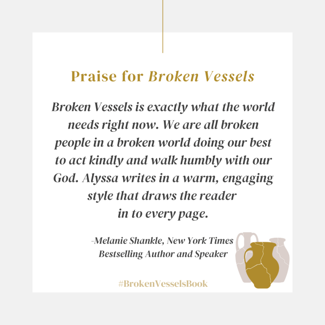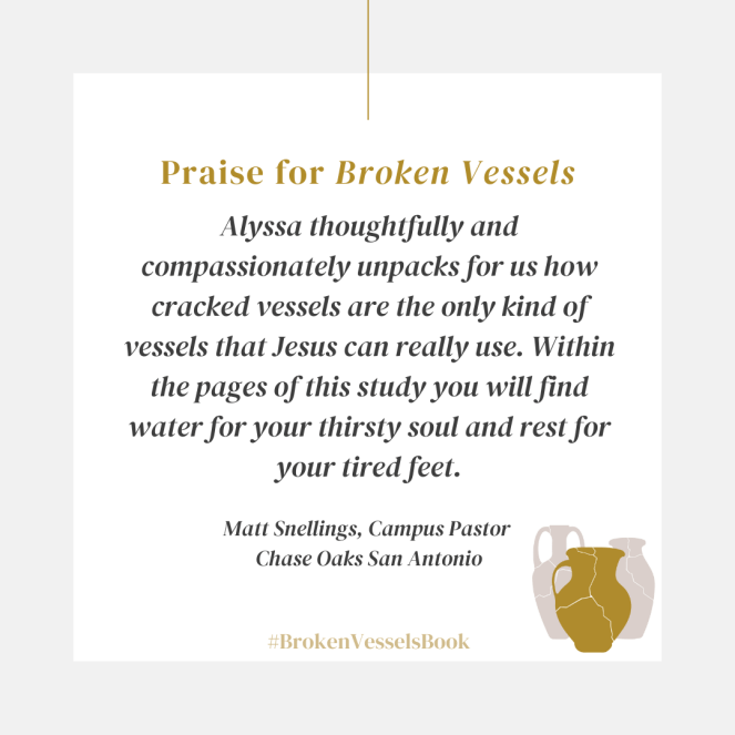 Share your thoughts, quotes, and pictures using #brokenvesselsbook, so we can share the experience with each other. I am [personally] excited to see what resonates with you in the study.