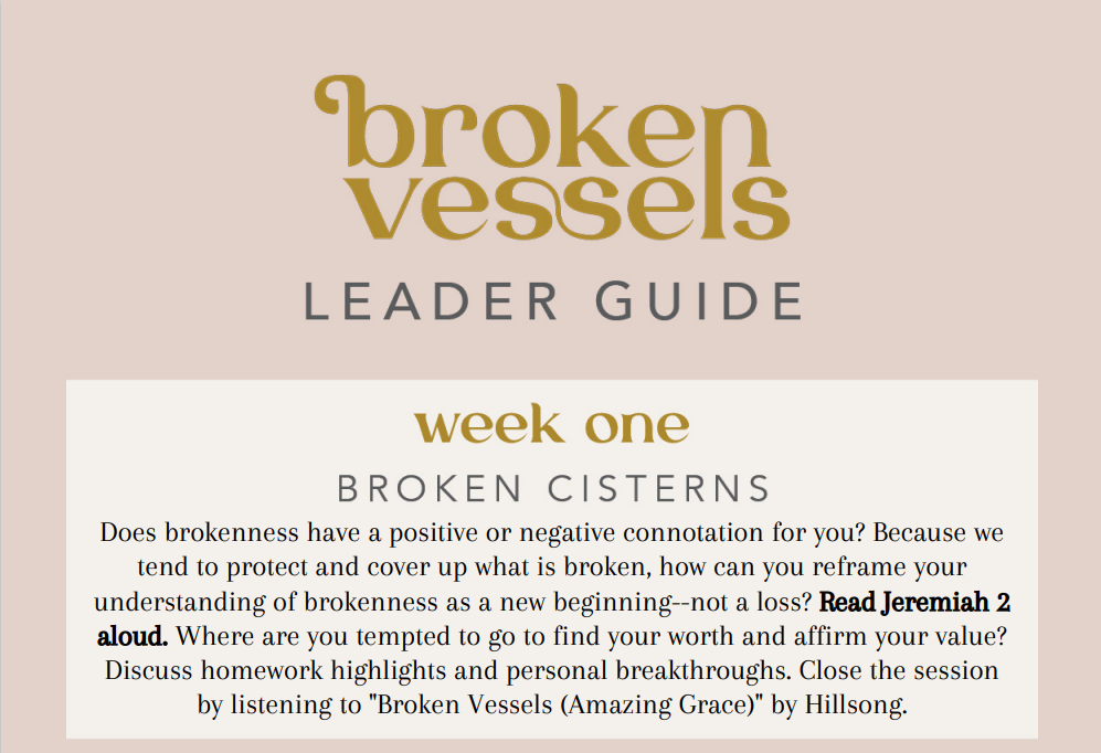 The Broken Vessels Leader Guide offers simple suggestions for helping your small group start a conversation and continue the discussion after each week of study. If you are studying outside a small group setting, no worries. The guide can be used for personal reflection.