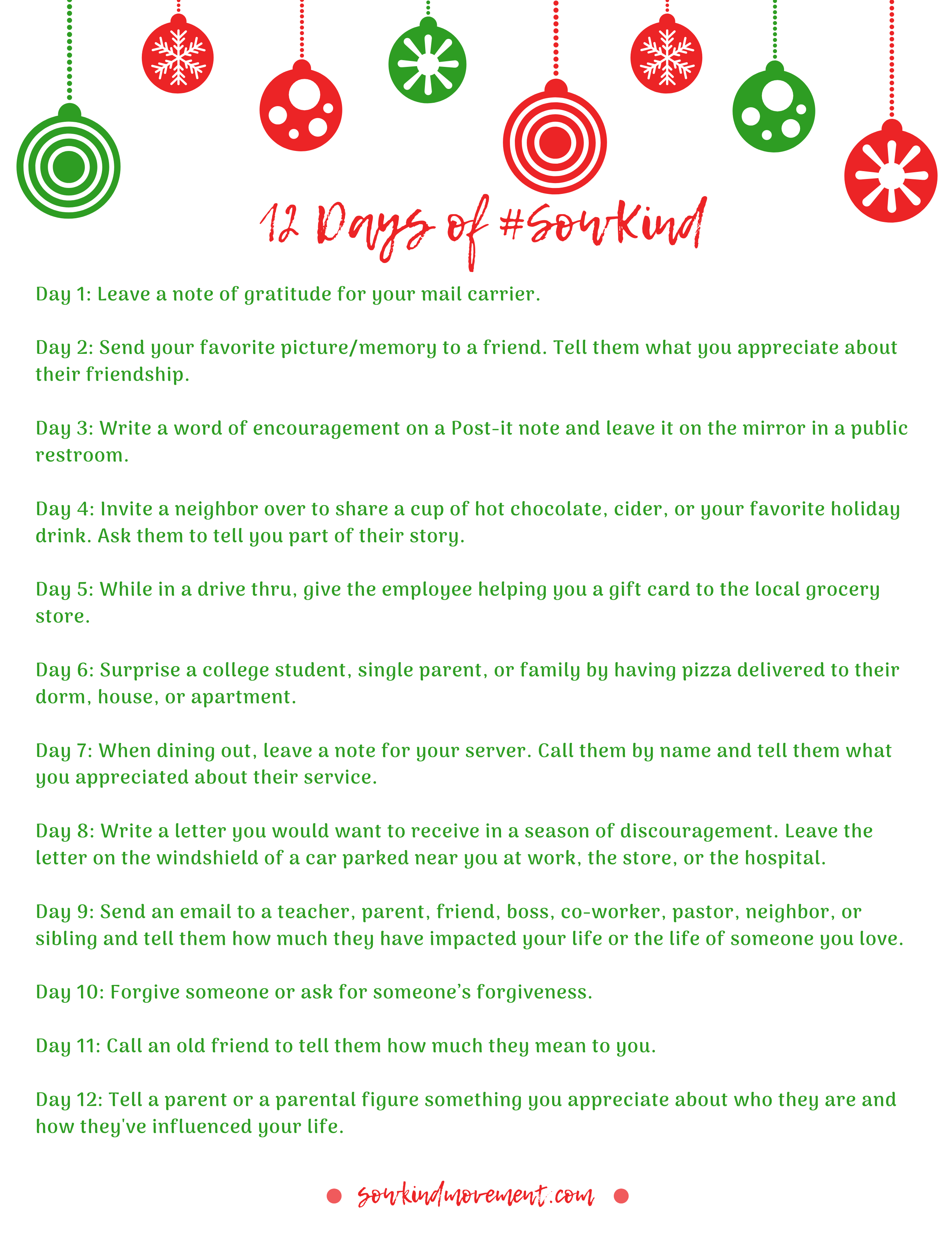 I would love to hear how you are implementing any of the #sowkind suggestions into your holiday season. If you use the hashtag, your picture will be visible to anyone who searches the hashtag. Seeing your adventures is both encouraging and inspiring. In case you didn’t know, the #sowkindmovement has a website. Check it out here. ✔️