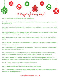 We took the ideas from 2019 and created a 2020 #Sowkind Advent[ure] Calendar© you can print off and put in your house or office. These ideas do not cost much, but they have an incredible return.