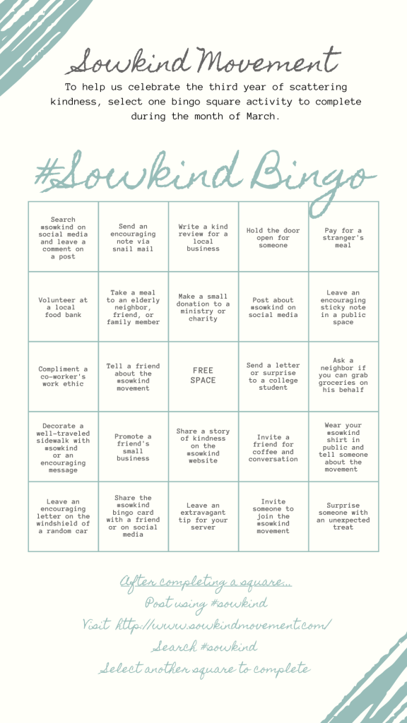 After completing the activity in your square, post on your blog or social media using #sowkind and #sowkindmovement. Bonus if you are wearing a #sowkind shirt or if you include a photo of you completing your act of kindness.