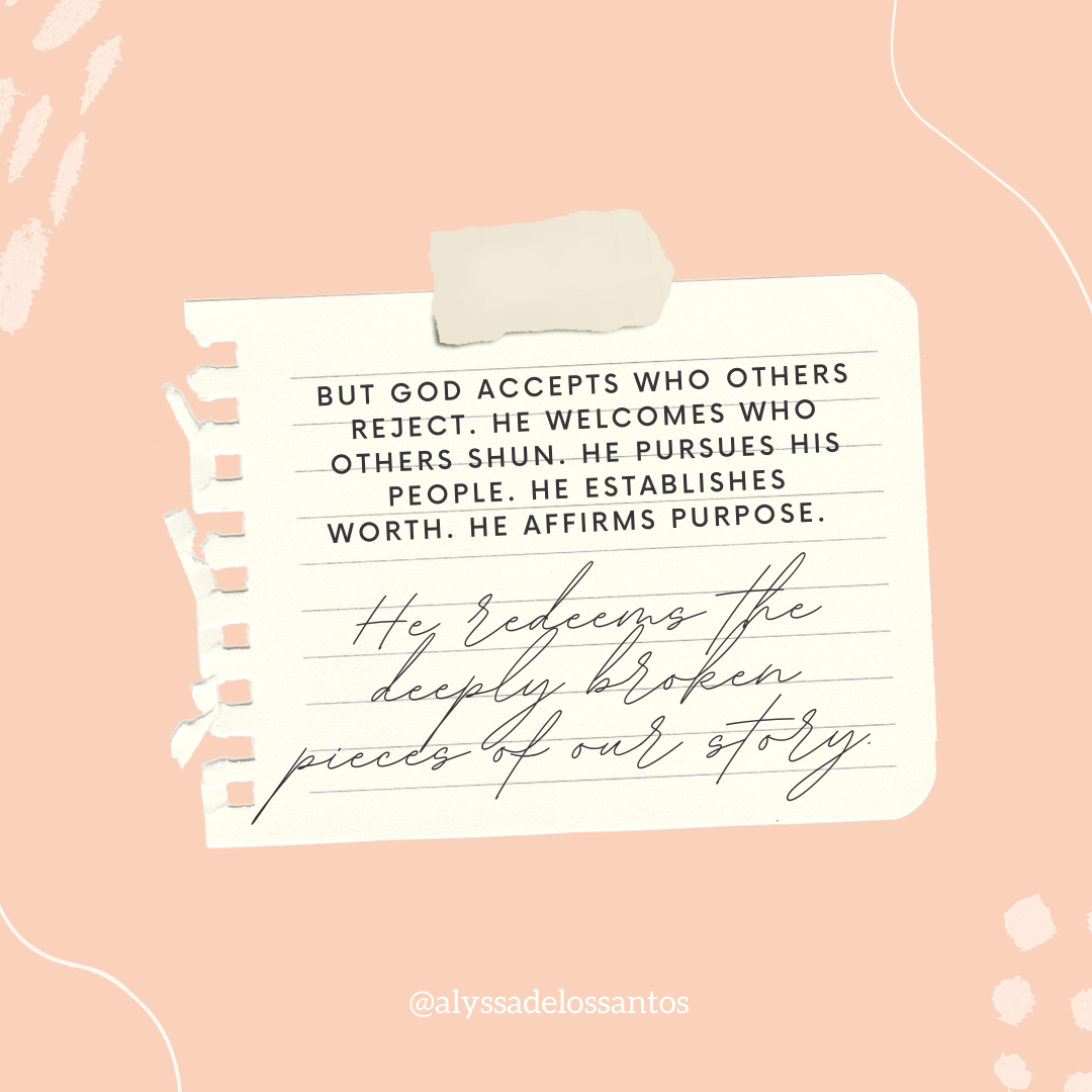 That is the thing about God–he accepts who others reject. He welcomes who others shun. He pursues his people. He establishes worth. He affirms purpose. He redeems the deeply broken pieces of our story.