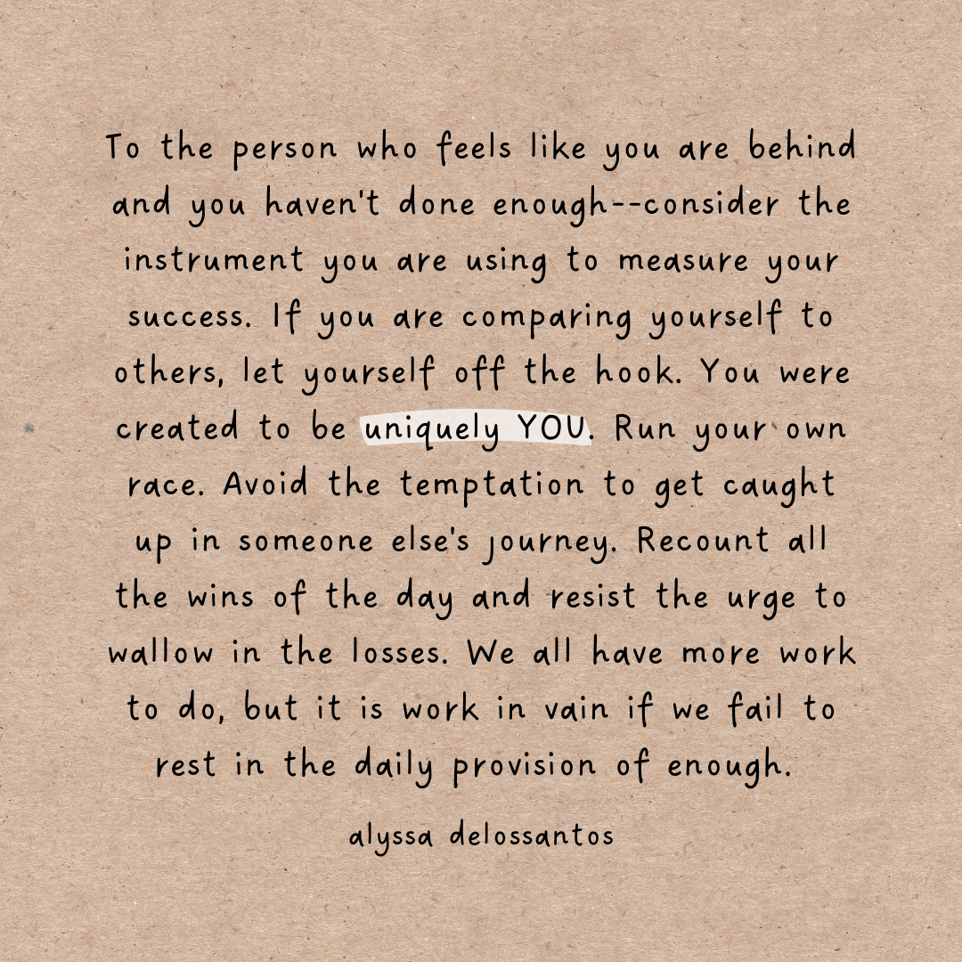 When you start to feel sideways about success, consider the tool you are using to measure. If you are using someone else’s success to measure your value, it’s time to break up with that mindset. Reframe success as doing your work and resting in the provision of enough.