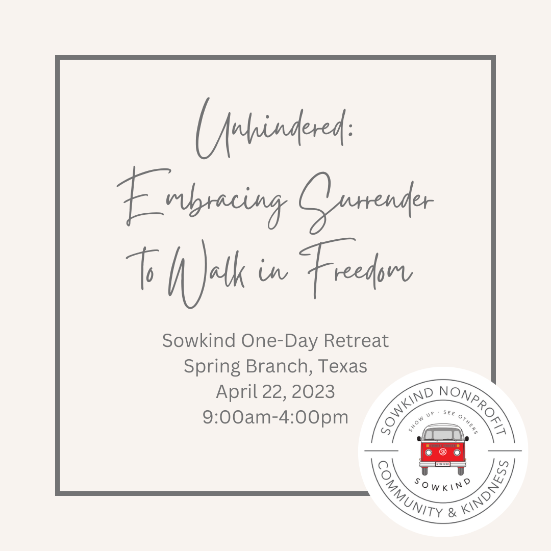 Unhindered: Embracing Surrender to Walk in Freedom is sponsored by the Sowkind Nonprofit. As you know, this is the nonprofit we created to continue the work of the #sowkind movement we started several years ago. The venue offers attendees a lovely backdrop to exercise turning kindness inward to experience healing and personal growth.